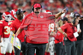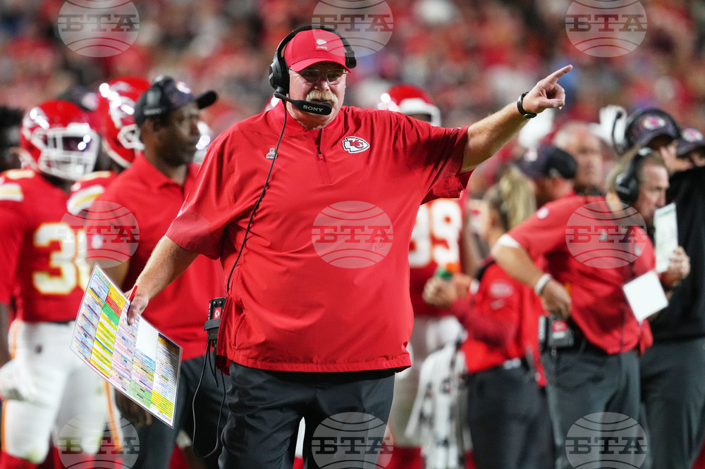 Kansas City Chiefs head coach Andy Reid watches from the sidelines during the first half of an NFL football game against the Detroit Lions Sunday, Oct. 12, 2025, in Kansas City, Mo. (AP Photo/Ed Zurga)