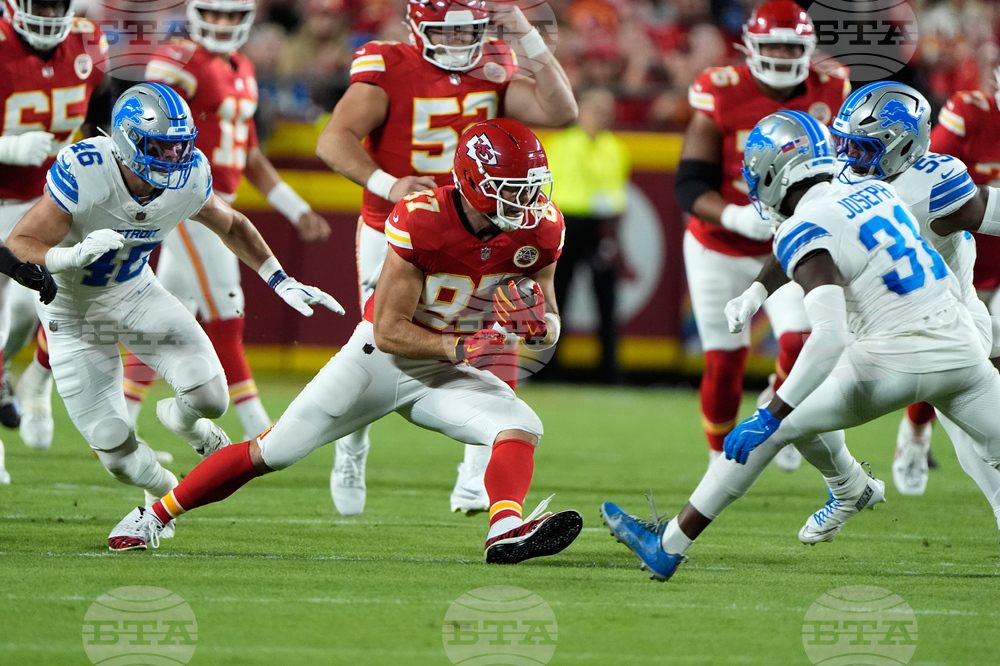 Kansas City Chiefs tight end Travis Kelce (87) runs with the ball as Detroit Lions safety Kerby Joseph (31) and linebacker Jack Campbell (46) defend during the first half of an NFL football game Sunday, Oct. 12, 2025, in Kansas City, Mo. (AP Photo/Charlie Riedel)