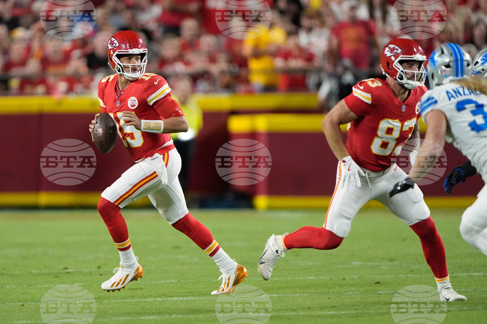 Kansas City Chiefs quarterback Patrick Mahomes (15) throws over Detroit Lions linebacker Alex Anzalone (34) during the first half of an NFL football game Sunday, Oct. 12, 2025, in Kansas City, Mo. (AP Photo/Ed Zurga)
