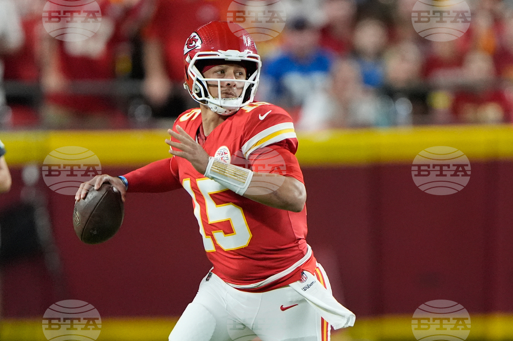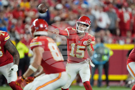 Kansas City Chiefs quarterback Patrick Mahomes (15) throws during the first half of an NFL football game against the Detroit Lions Sunday, Oct. 12, 2025, in Kansas City, Mo. (AP Photo/Charlie Riedel)
