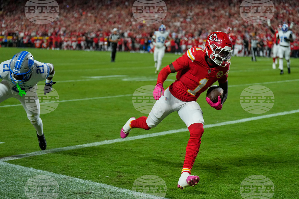 Kansas City Chiefs wide receiver Xavier Worthy (1) scores past Detroit Lions cornerback Amik Robertson (21) during the first half of an NFL football game Sunday, Oct. 12, 2025, in Kansas City, Mo. (AP Photo/Charlie Riedel)