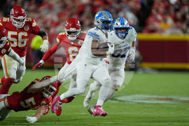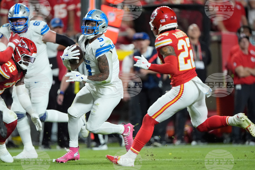Detroit Lions running back David Montgomery (5) runs with the ball as Kansas City Chiefs linebacker Leo Chenal defends during the first half of an NFL football game Sunday, Oct. 12, 2025, in Kansas City, Mo. (AP Photo/Charlie Riedel)