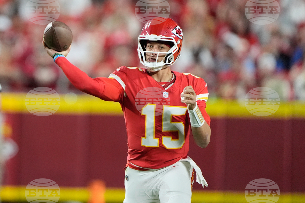 Kansas City Chiefs quarterback Patrick Mahomes warms up before an NFL football game against the Detroit Lions Sunday, Oct. 12, 2025, in Kansas City, Mo. (AP Photo/Charlie Riedel)