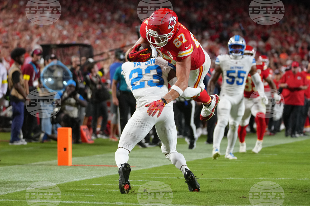 Detroit Lions tight end Sam LaPorta, left, scores past Kansas City Chiefs defensive back Chamarri Conner (27) during the second half of an NFL football game Sunday, Oct. 12, 2025, in Kansas City, Mo. (AP Photo/Ed Zurga)