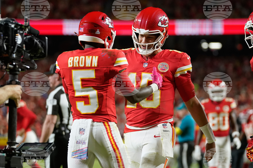 Kansas City Chiefs wide receiver Hollywood Brown (5) is congratulated by quarterback Patrick Mahomes (15) after scoring during the second half of an NFL football game against the Detroit Lions Sunday, Oct. 12, 2025, in Kansas City, Mo. (AP Photo/Ed Zurga)