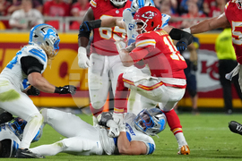 Kansas City Chiefs wide receiver JuJu Smith-Schuster (9) runs with the ball as Detroit Lions cornerback Rock Ya-Sin (23) and linebacker Alex Anzalone defend during the first half of an NFL football game Sunday, Oct. 12, 2025, in Kansas City, Mo. (AP Photo/Charlie Riedel)