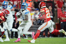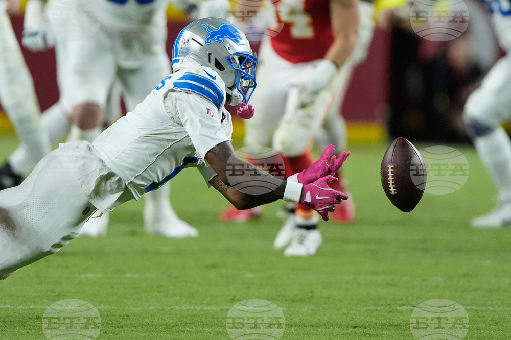 Detroit Lions wide receiver Jameson Williams is unable to catch a pass on fourth down during the second half of an NFL football game against the Kansas City Chiefs Sunday, Oct. 12, 2025, in Kansas City, Mo. (AP Photo/Charlie Riedel)