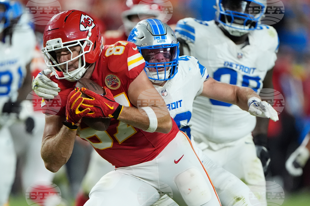 Kansas City Chiefs tight end Travis Kelce, left, gains a first down before being brought down by Detroit Lions linebacker Jack Campbell, right, during the second half of an NFL football game Sunday, Oct. 12, 2025, in Kansas City, Mo. (AP Photo/Charlie Riedel)1