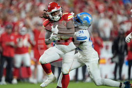 Kansas City Chiefs running back Kareem Hunt, left, runs with the ball as Detroit Lions safety Kerby Joseph (31) defends during the second half of an NFL football game Sunday, Oct. 12, 2025, in Kansas City, Mo. (AP Photo/Charlie Riedel)