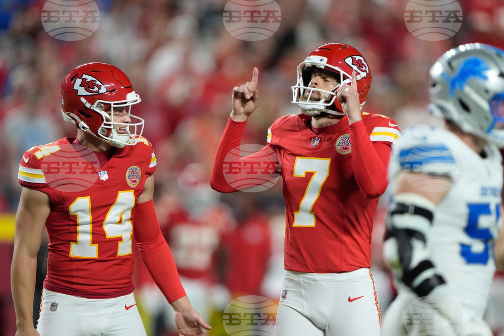 Kansas City Chiefs place kicker Harrison Butker (7) celebrates after making a 33-yard field goal during the second half of an NFL football game against the Detroit Lions Sunday, Oct. 12, 2025, in Kansas City, Mo. (AP Photo/Charlie Riedel)
