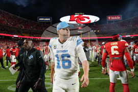 Detroit Lions quarterback Jared Goff walks off the field following an NFL football game against the Kansas City Chiefs Sunday, Oct. 12, 2025, in Kansas City, Mo. (AP Photo/Ed Zurga)
