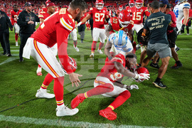 Kansas City Chiefs quarterback Patrick Mahomes (15) tries to break up a fight between teammate JuJu Smith-Schuster and Detroit Lions defensive back Brian Branch following an NFL football game Sunday, Oct. 12, 2025, in Kansas City, Mo. (AP Photo/Charlie Riedel)