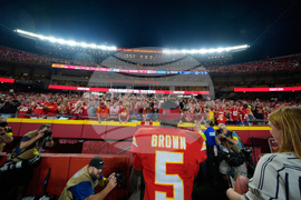 Kansas City Chiefs wide receiver Hollywood Brown celebrates with fans after scoring during the second half of an NFL football game against the Detroit Lions Sunday, Oct. 12, 2025, in Kansas City, Mo. (AP Photo/Ed Zurga)