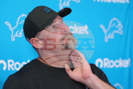 Detroit Lions head coach Dan Campbell pauses during a news conference following an NFL football game against the Kansas City Chiefs Sunday, Oct. 12, 2025, in Kansas City, Mo. (AP Photo/Ed Zurga)