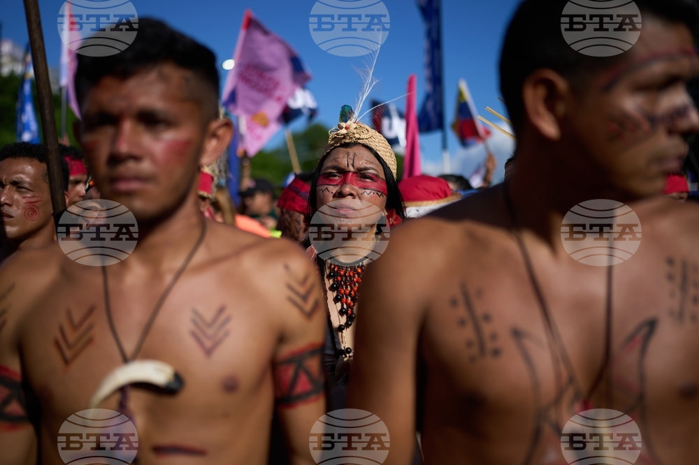 People take part in an event on Indigenous Day in Caracas, Venezuela Sunday, Oct. 12, 2025. (AP Photo/Ariana Cubillos)