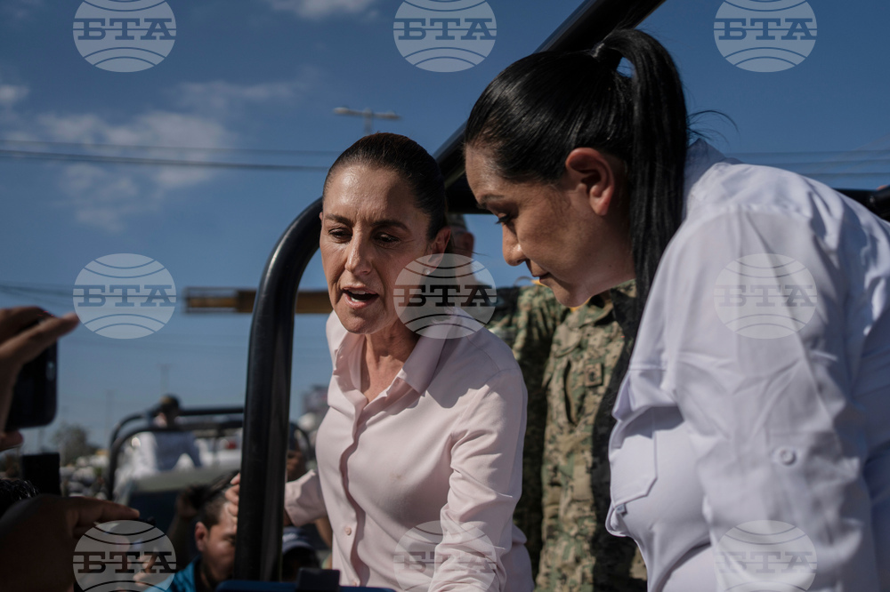 Mexican President Claudia Sheinbaum, left, and Veracruz Gov. Rocío Nahle García survey authorities' aid distribution in Poza Rica, Mexico, Sunday, Oct. 12, 2025, after widespread flooding and landslides. (AP Photo/Felix Marquez)