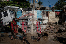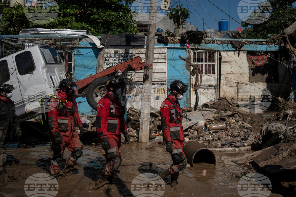 Rescue workers patrol a street in Poza Rica, Mexico, Sunday, Oct. 12, 2025, after widespread flooding. (AP Photo/Felix Marquez)
