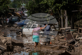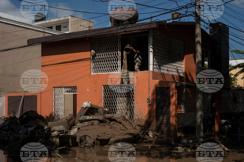 A local cleans a flooded house in Poza Rica, Veracruz state, Mexico, Sunday, Oct. 12, 2025. (AP Photo/Felix Marquez)