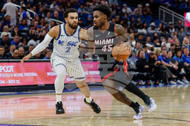 Miami Heat guard Davion Mitchell (45) drives against Orlando Magic guard Tyus Jones (2) during the first half of a preseason NBA basketball game, Sunday, Oct. 12, 2025, in Orlando, Fla. (AP Photo/Kevin Kolczynski)