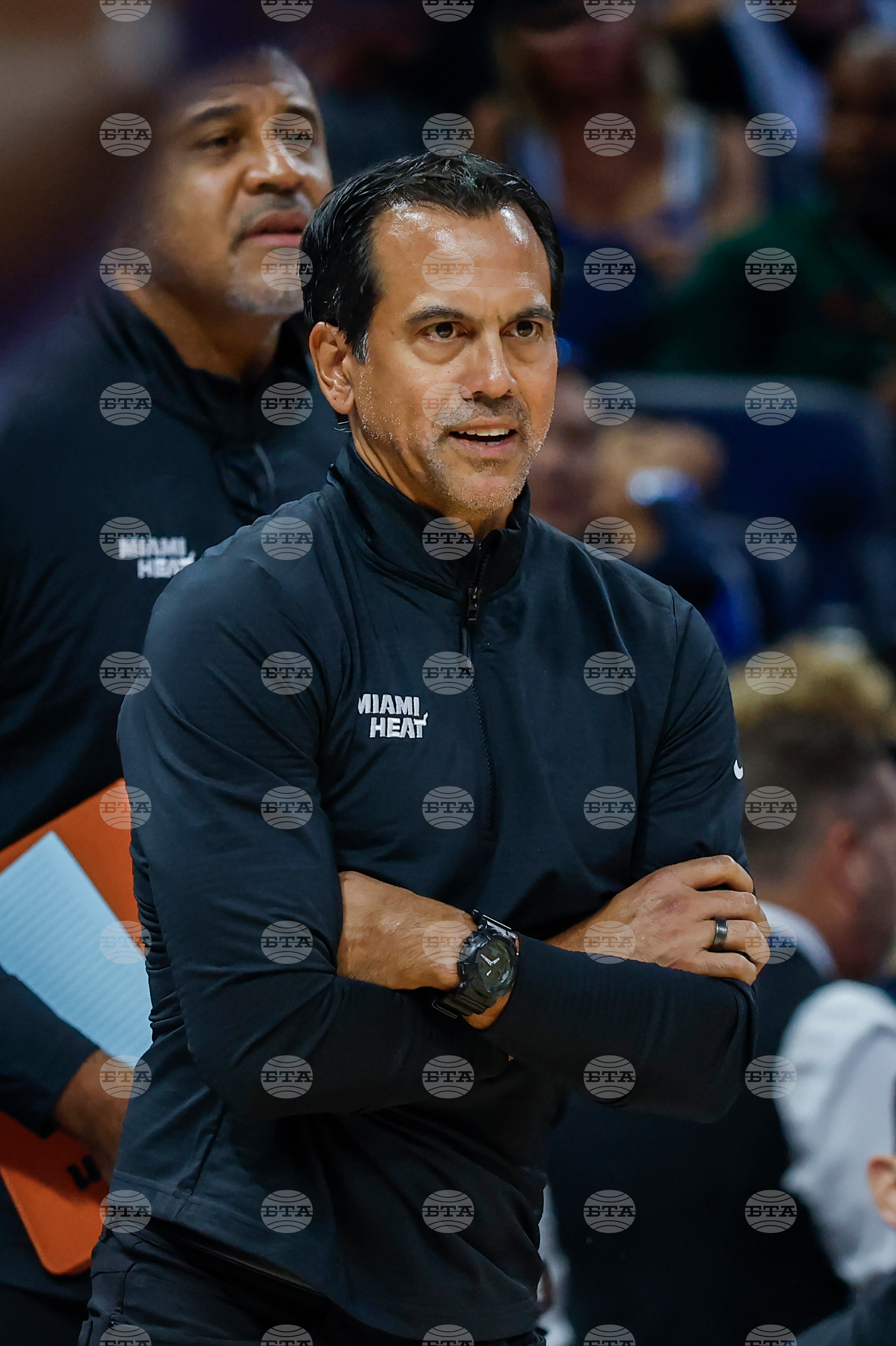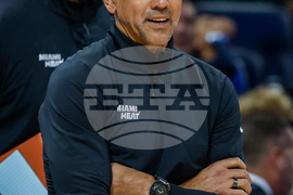 Miami Heat head coach Erik Spoelstra watches his team play against the Orlando Magic during the first half of a preseason NBA basketball game, Sunday, Oct. 12, 2025, in Orlando, Fla. (AP Photo/Kevin Kolczynski)