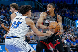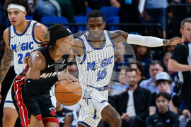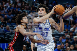 Orlando Magic forward Noah Penda (93) defends against Miami Heat forward Keshad Johnson, right, during the first half of a preseason NBA basketball game, Sunday, Oct. 12, 2025, in Orlando, Fla. (AP Photo/Kevin Kolczynski)