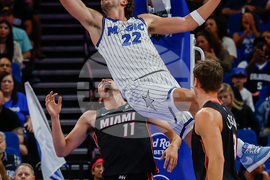Orlando Magic forward Franz Wagner (22) dunks over Miami Heat guard Jaime Jaquez Jr. (11) during the first half of a preseason NBA basketball game, Sunday, Oct. 12, 2025, in Orlando, Fla. (AP Photo/Kevin Kolczynski)