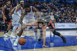 Orlando Magic forward Jamal Cain (8) and Miami Heat guard Ethan Thompson (55) go up for rebound during the second half of a preseason NBA basketball game, Sunday, Oct. 12, 2025, in Orlando, Fla. (AP Photo/Kevin Kolczynski)