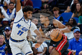 Miami Heat guard Kasparas Jakučionis (25) is defended by Orlando Magic center Wendell Carter Jr. (34) during the first half of a preseason NBA basketball game, Sunday, Oct. 12, 2025, in Orlando, Fla. (AP Photo/Kevin Kolczynski)