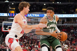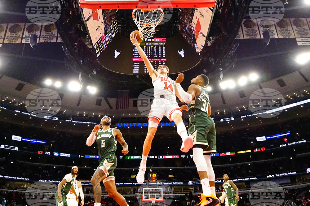 Chicago Bulls forward Matas Buzelis (14) is defended by Milwaukee Bucks forward Giannis Antetokounmpo (34) during the second half of a preseason NBA basketball game Sunday, Oct. 12, 2025, in Chicago. (AP Photo/David Banks)