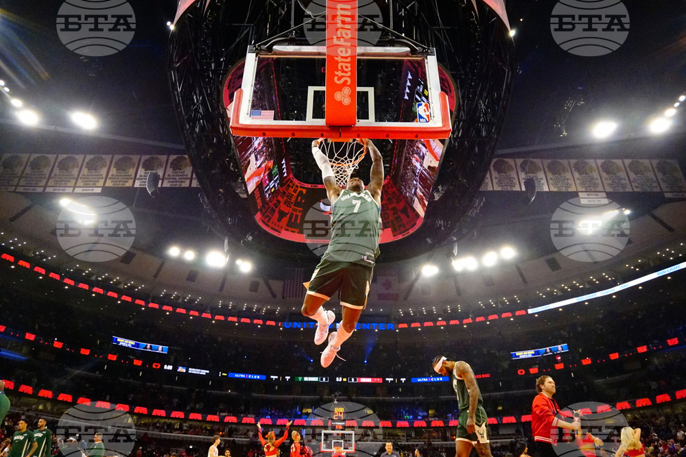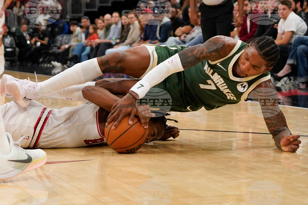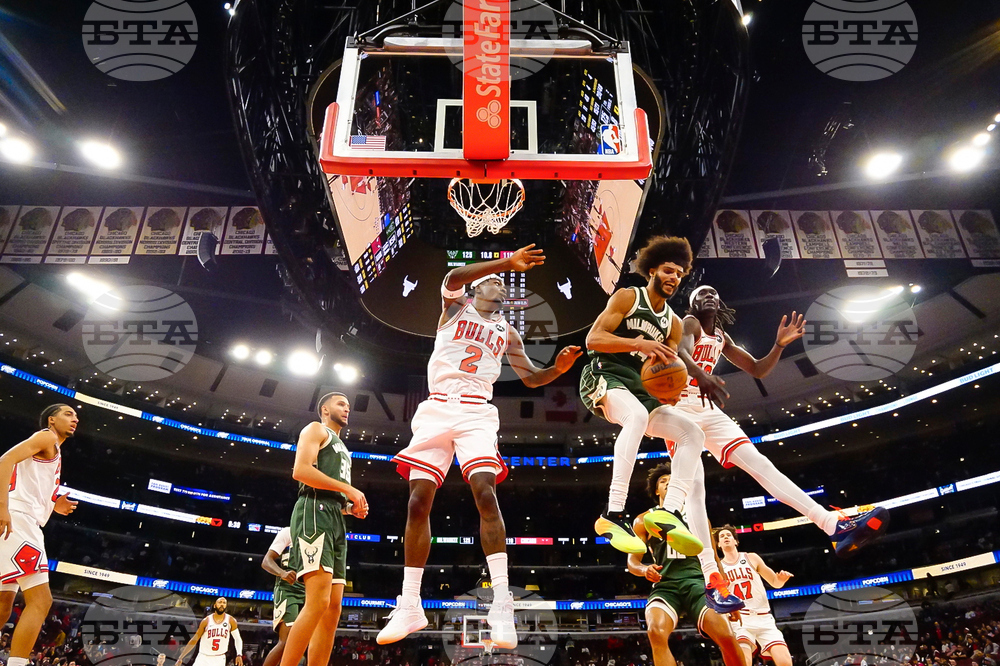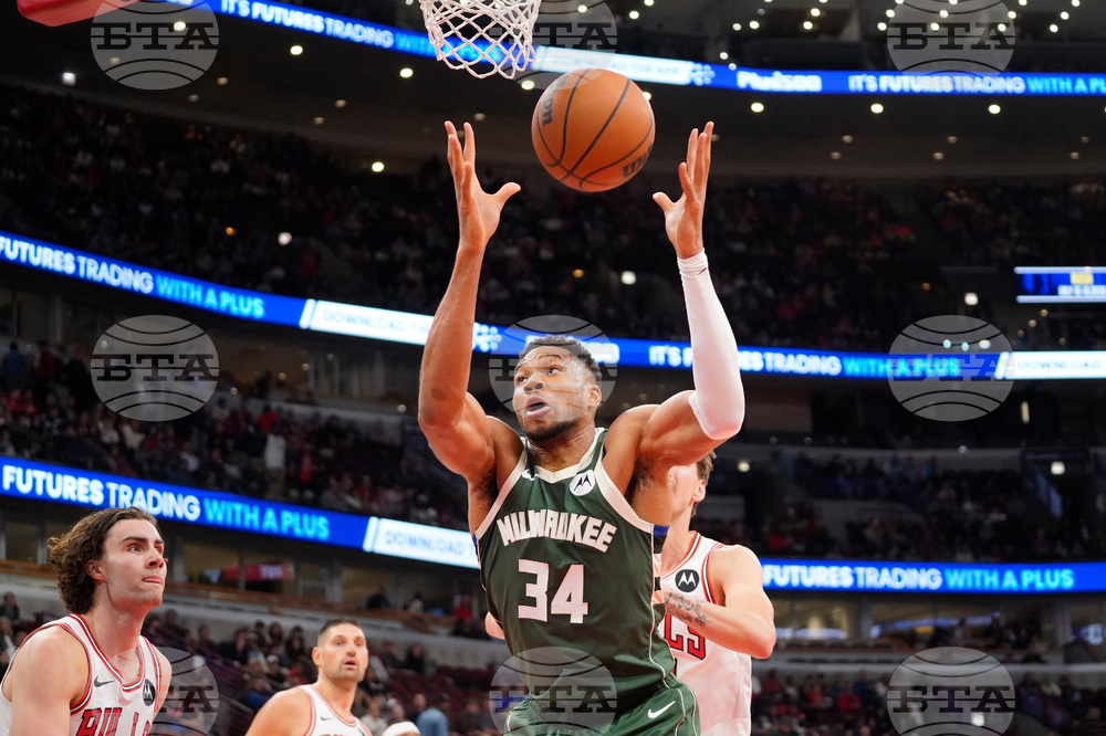 Milwaukee Bucks forward Giannis Antetokounmpo (34) grabs a rebound against the Chicago Bulls during the first half of a preseason NBA basketball game Sunday, Oct. 12, 2025, in Chicago. (AP Photo/David Banks)