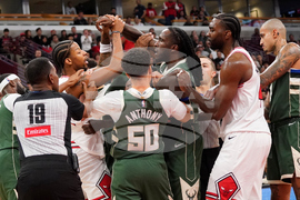 the Chicago Bulls and the Milwaukee Bucks get into a skirmish during the second half of a preseason NBA basketball game Chicago Bulls forward Dalen Terry (7) was ejected from the game Sunday, Oct. 12, 2025, in Chicago. (AP Photo/David Banks)