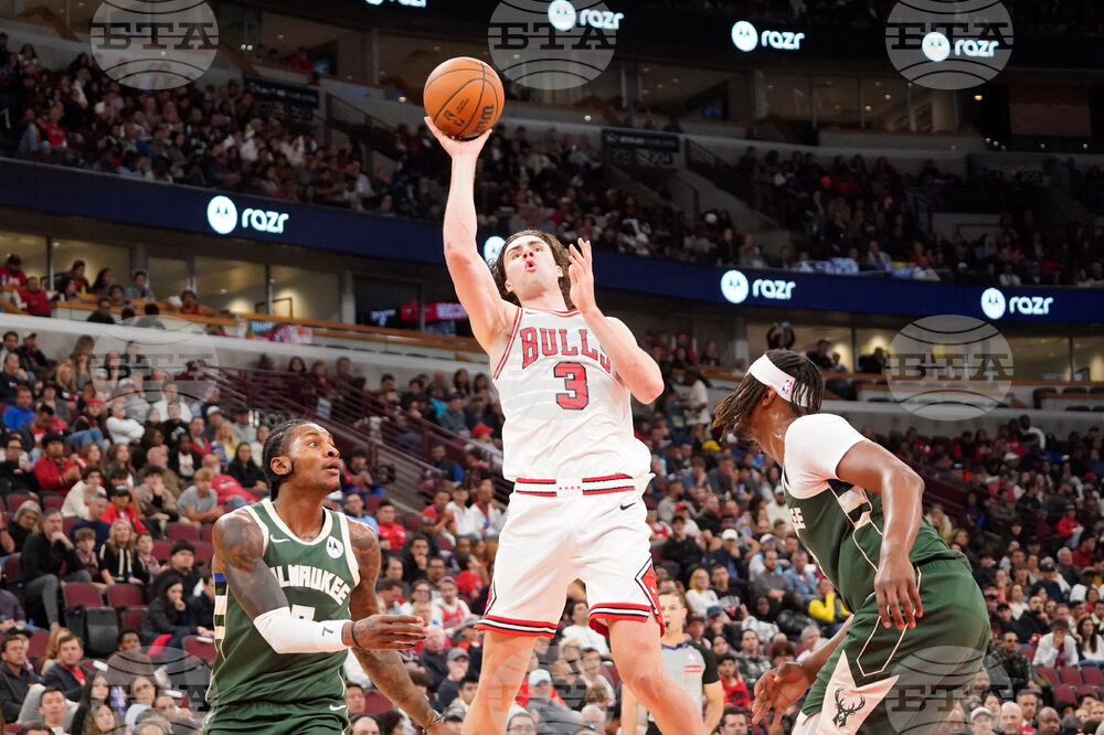 Chicago Bulls guard Josh Giddey, left, and forward Matas Buzelis, right, defend against Milwaukee Bucks forward Giannis Antetokounmpo, center, during the first half of a preseason NBA basketball game Sunday, Oct. 12, 2025, in Chicago. (AP Photo/David Banks)