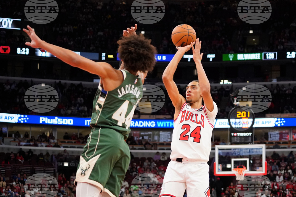 Chicago Bulls guard Emmanuel Miller, left, and forward Mouhamadou Gueye, right, defend Milwaukee Bucks guard Andre Jackson Jr, center during the second half of a preseason NBA basketball game Sunday, Oct. 12, 2025, in Chicago. (AP Photo/David Banks)