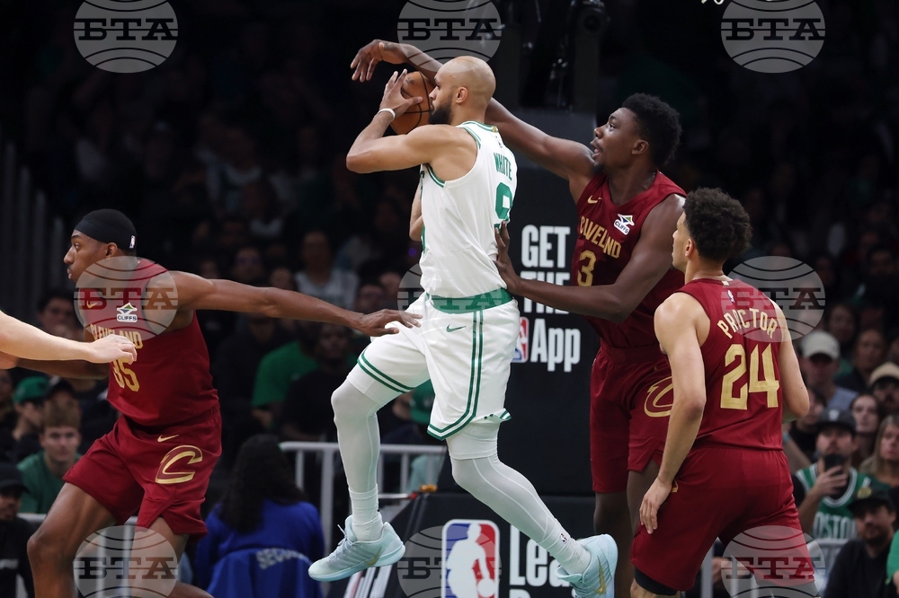 Boston Celtics' Derrick White (9) looks to pass the ball off against Cleveland Cavaliers' Thomas Bryant (3) and Tyrese Proctor (24) during the first half of a preseason NBA basketball game, Sunday, Oct. 12, 2025, in Boston. (AP Photo/Michael Dwyer)