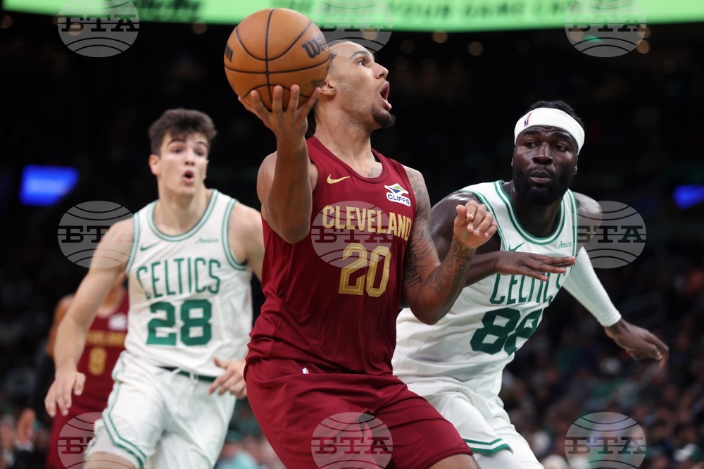 Cleveland Cavaliers' Jaylon Tyson (20) shoots abasing Boston Celtics' Neemias Queta (88) and Hugo González (28) during the first half of a preseason NBA basketball game, Sunday, Oct. 12, 2025, in Boston. (AP Photo/Michael Dwyer)