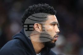 Boston Celtics' Jayson Tatum sits on the bench during the first half of a preseason NBA basketball game against the Cleveland Cavaliers, Sunday, Oct. 12, 2025, in Boston. (AP Photo/Michael Dwyer)