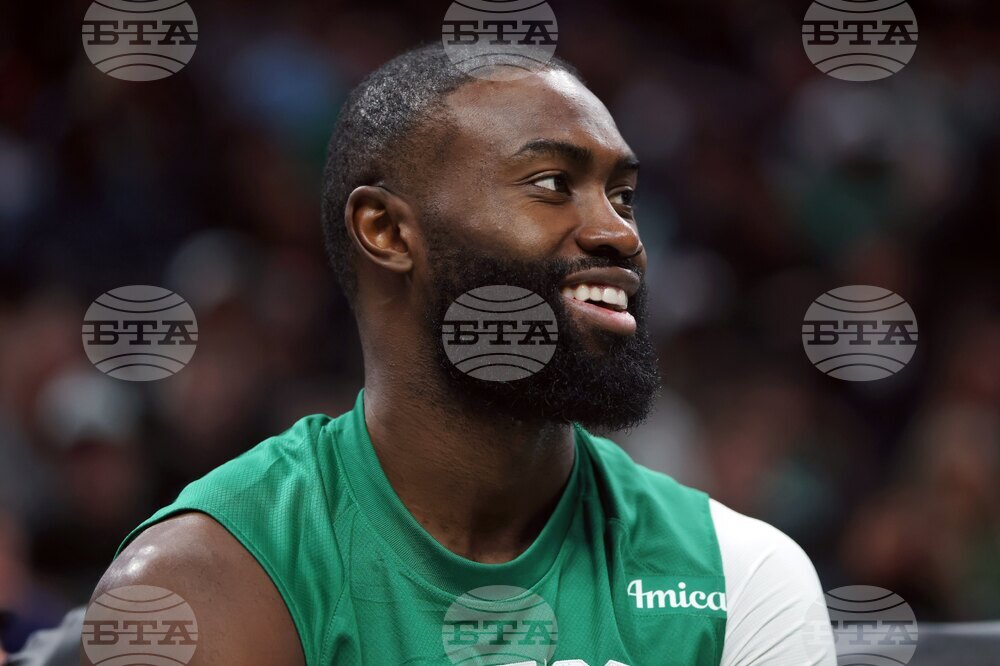 Boston Celtics' Jaylen Brown sits on the bench during the second half of a preseason NBA basketball game against the Cleveland Cavaliers, Sunday, Oct. 12, 2025, in Boston. (AP Photo/Michael Dwyer)