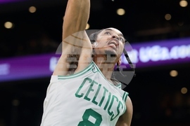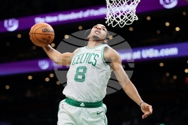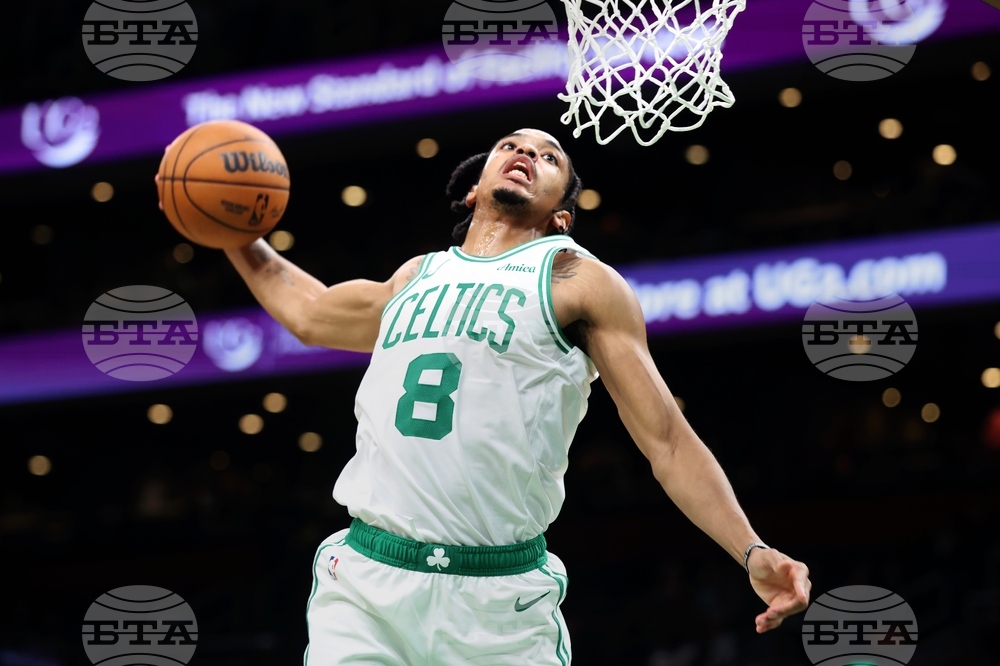 Boston Celtics' Josh Minott dunks during the second half of a preseason NBA basketball game against the Cleveland Cavaliers, Sunday, Oct. 12, 2025, in Boston. (AP Photo/Michael Dwyer)