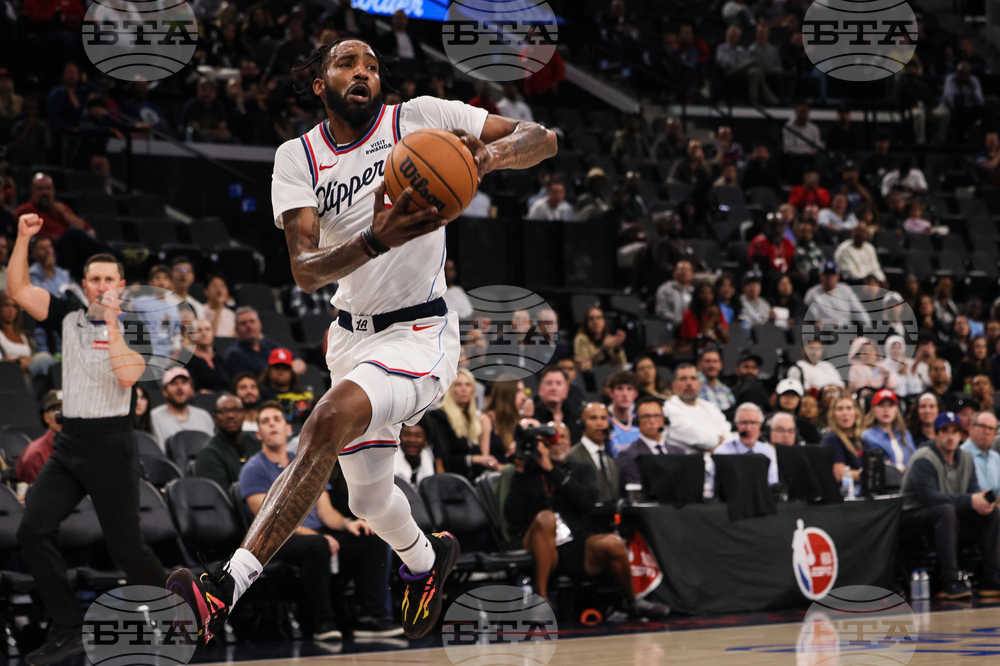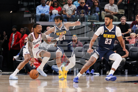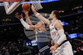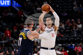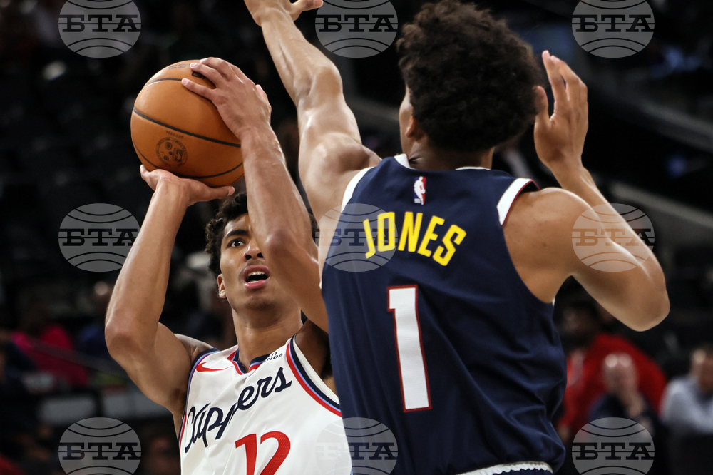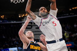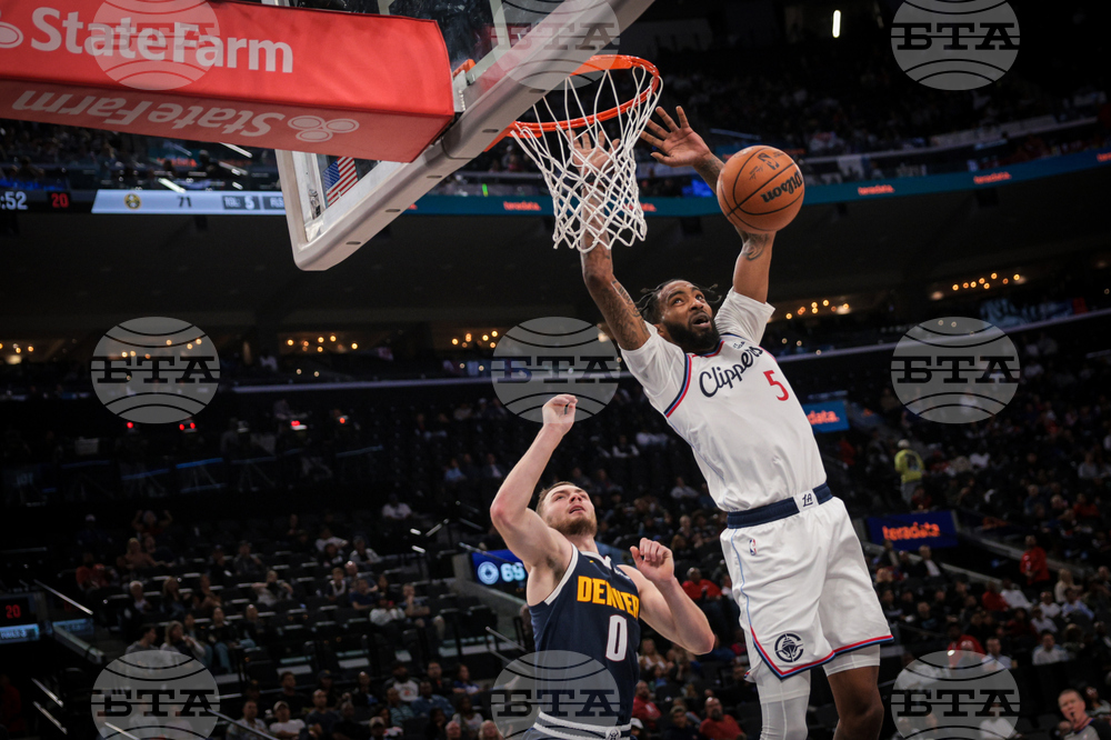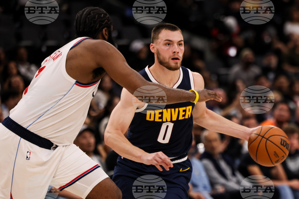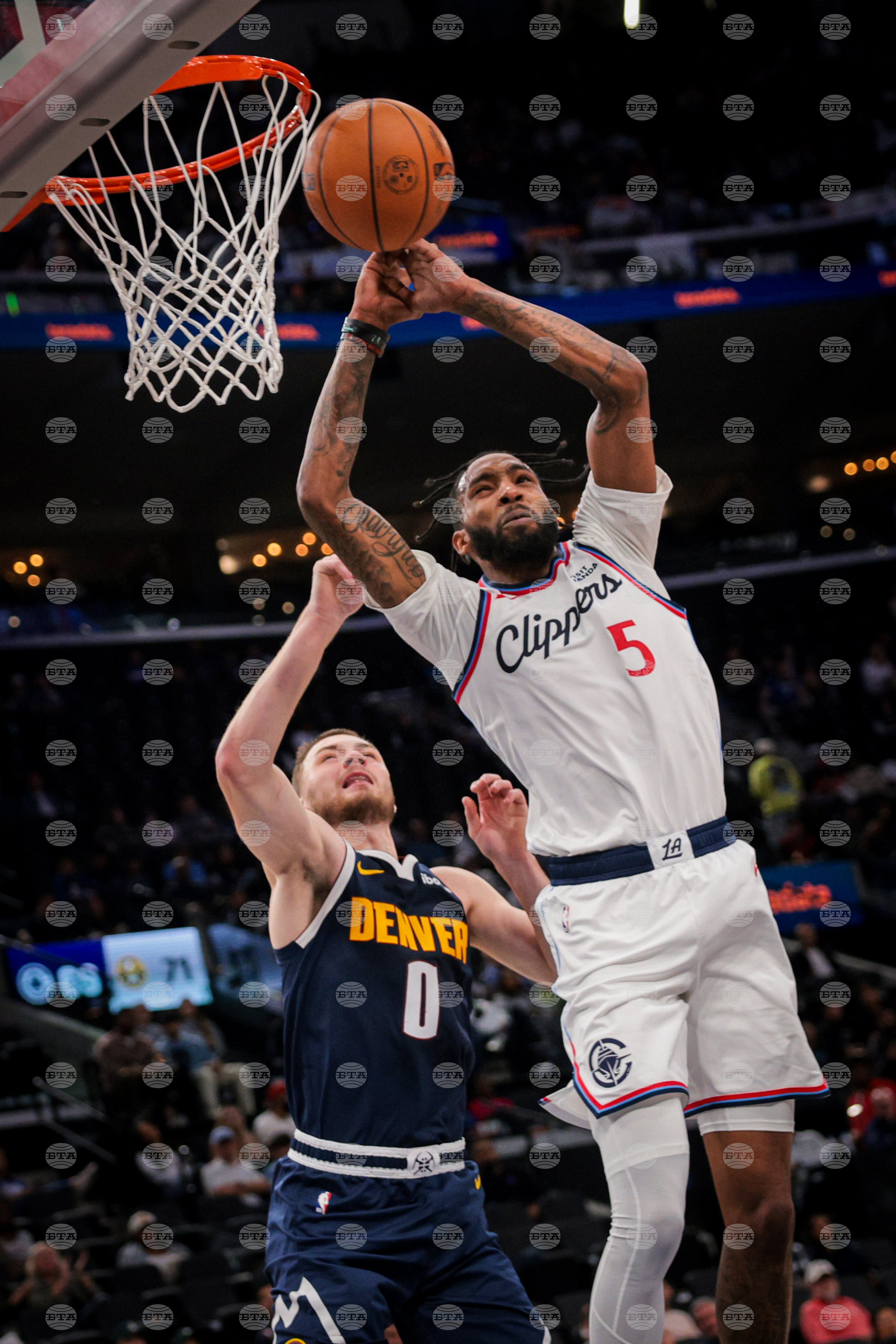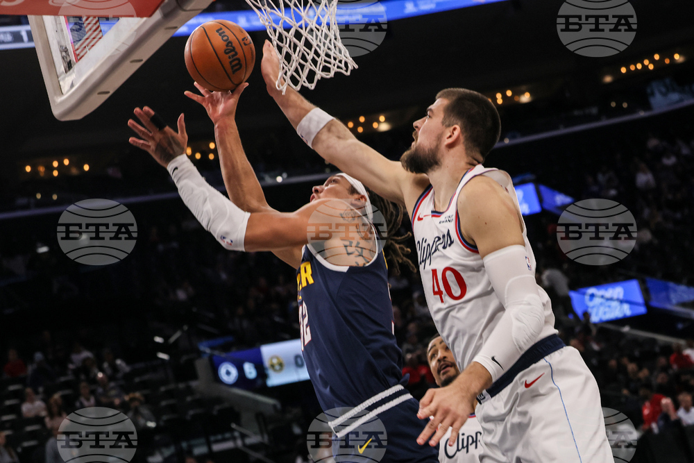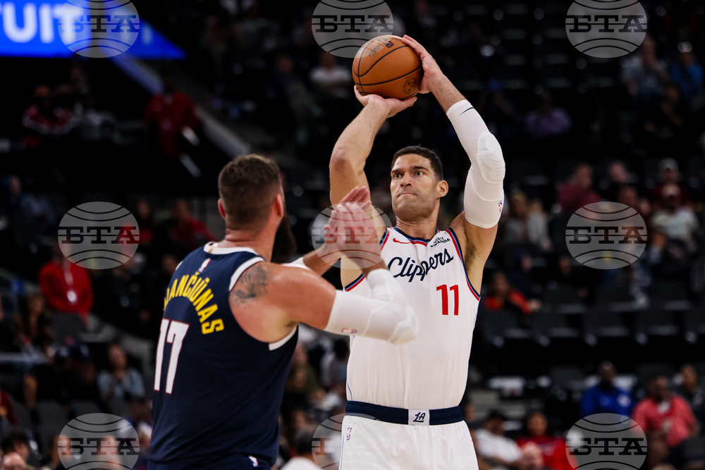 /Los Angeles Clippers guard-forward Nicolas Batum, right, vies for the ball against Denver Nuggets center Jonas Valanciunas, left, and Denver Nuggets forward Cameron Johnson during the second half of a preseason NBA basketball game, Sunday, Oct. 12, 2025, in Inglewood, Calif. (AP Photo/Etienne Laurent)