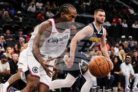 Denver Nuggets forward Aaron Gordon, left, dribbles past Los Angeles Clippers forward Kawhi Leonard during the first half of a preseason NBA basketball game, Sunday, Oct. 12, 2025, in Inglewood, Calif. (AP Photo/Etienne Laurent)