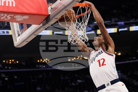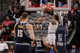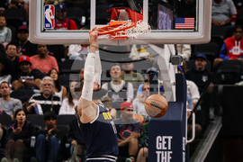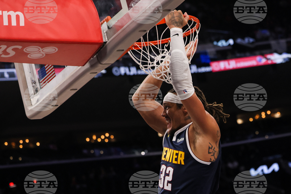 Denver Nuggets center Jonas Valanciunas scores during the second half of a preseason NBA basketball game against the Los Angeles Clippers, Sunday, Oct. 12, 2025, in Inglewood, Calif. (AP Photo/Etienne Laurent)