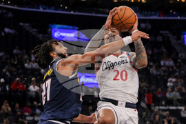 Los Angeles Clippers center Yanic Konan Niederhauser, center, vies for a rebound against Denver Nuggets guard Curtis Jones, left, and Denver Nuggets forward Hunter Tyson during the second half of a preseason NBA basketball game, Sunday, Oct. 12, 2025, in Inglewood, Calif. (AP Photo/Etienne Laurent)