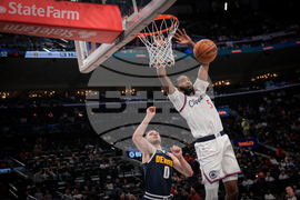 Los Angeles Clippers forward Derrick Jones Jr., right, scores against Denver Nuggets guard Christian Braun during the second half of a preseason NBA basketball game, Sunday, Oct. 12, 2025, in Inglewood, Calif. (AP Photo/Etienne Laurent)