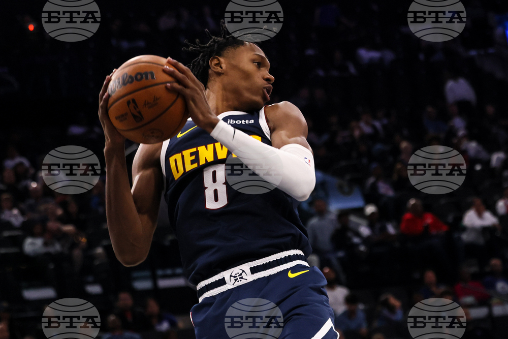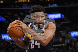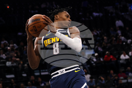 Denver Nuggets guard Peyton Watson catches a rebound during the second half of a preseason NBA basketball game against the Los Angeles Clippers, Sunday, Oct. 12, 2025, in Inglewood, Calif. (AP Photo/Etienne Laurent)