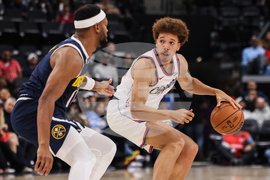 Los Angeles Clippers guard Kris Dunn, left, dribbles past Denver Nuggets guard Peyton Watson during the second half of a preseason NBA basketball game, Sunday, Oct. 12, 2025, in Inglewood, Calif. (AP Photo/Etienne Laurent)
