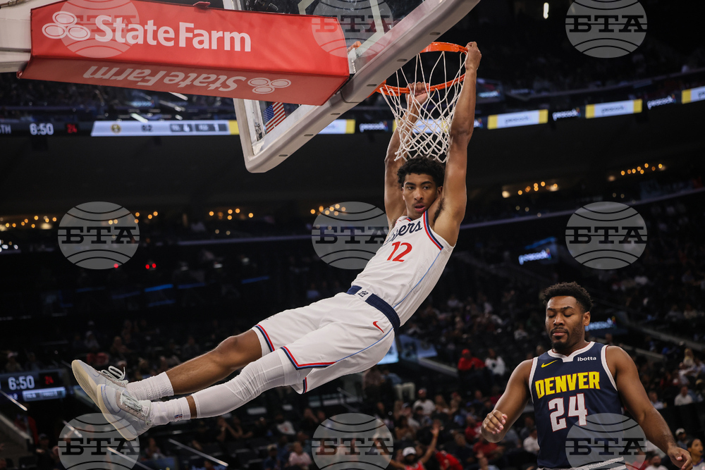 Los Angeles Clippers guard Cam Christie scores during the second half of a preseason NBA basketball game against the Denver Nuggets, Sunday, Oct. 12, 2025, in Inglewood, Calif. (AP Photo/Etienne Laurent)