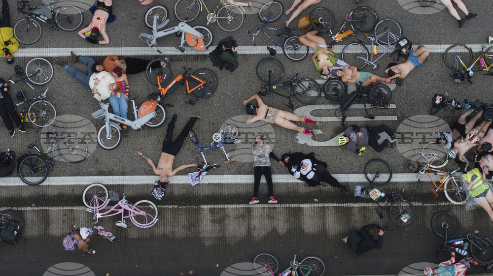 EDITORS NOTE NUDITY - Cyclists in the Naked Bike Ride lay down in protest against Donald Trump's attempts to mobilize the National Guard on the Burnside Bridge, Sunday, Oct. 12, 2025, in Portland, Ore. (AP Photo/Jenny Kane)