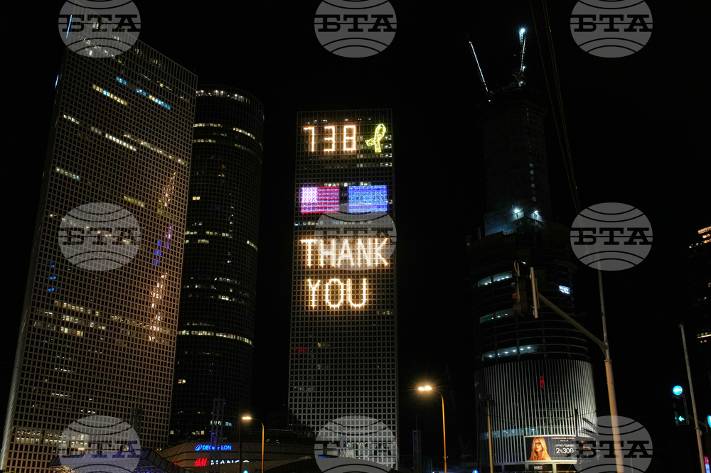 A counter placed on a high rise building shows the current number of days the Israeli hostages were held captive by Palestinian militants, in Tel Aviv, Israel, Monday, Oct. 13, 2025. (AP Photo/Ohad Zwigenberg)