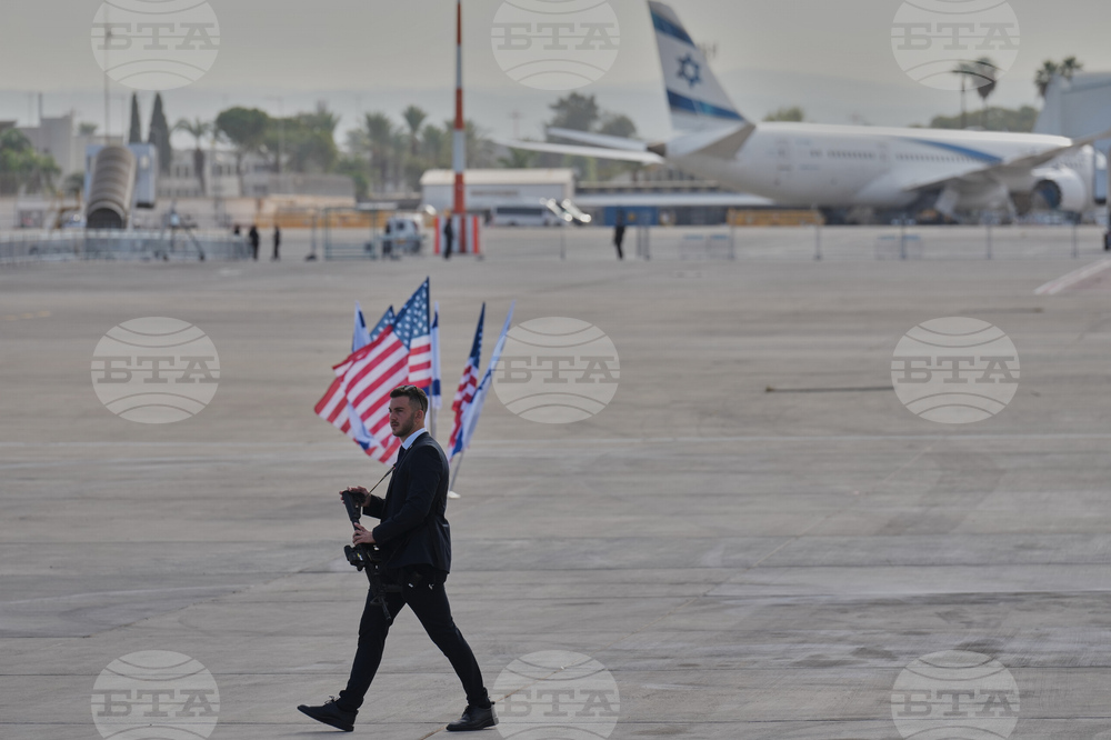 An Israeli security officer patrols the tarmac ahead of a welcoming ceremony for U.S. President Donald Trump's arrival at Ben Gurion Airport near Tel Aviv, Israel, Monday, Oct. 13, 2025. (AP Photo/Ariel Schalit)