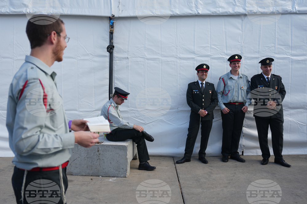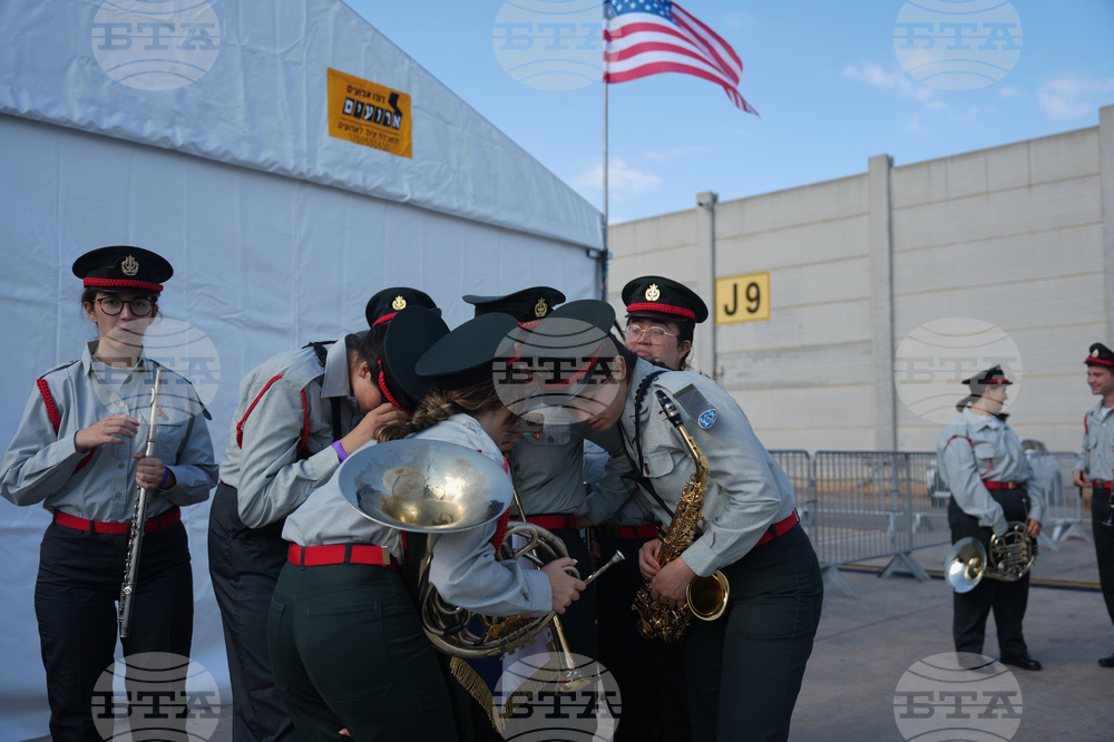 Members of an Israeli military band pose for a photo ahead of a welcoming ceremony for U.S. President Donald Trump's arrival at Ben Gurion Airport near Tel Aviv, Israel, Monday, Oct. 13, 2025. (AP Photo/Ariel Schalit)